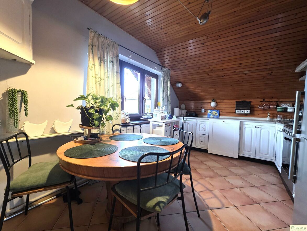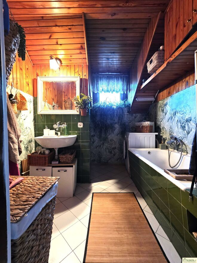 Na poddaszu mieści się: trzy ustawne pokoje, jeden z balkonem, osobna kuchnia oraz łazienka z wanną.