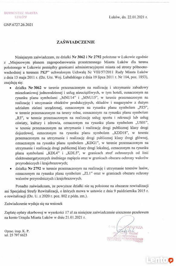 OKAZJA! Sprzedam bezpośrednio dużą uzbrojoną działkę (woda miejska,energia elektryczna (siła)na terenie miasta powiatowego Łuków .Idealne miejsce pod budowę osiedla domków .Bezpośrednio przy Dworcu Głównym. Przy ulicy asfaltowej,dobra komunikacja pociągi,autobusy. Teren ze względu na swoją wielkość tylko częściowo ogrodzony. Teren posiada plan zagospodarowania przestrzennego pod budownictwo jednorodzinne,przemysłowe ,hotele oraz oświatowe.Własność księga wieczysta.Na działce znajduje się dom oraz budynek gospodarczy. Powierzchnia działki 14884 m2. Cena 70.za m2.Tylko całość.Cena do negocjacji. Idealna inwestycja gotówki. Tu wybudujesz swój biznes: sklep,hotel,kwatery pracownicze,autokomis, itp. Teren posiada plan zagospodarowania przestrzennego przeznaczony pod budowę domów jednorodzinnych hal przemysłowych,obiektów oświatowych lub sportowych.Wszędzie blisko supermarkety,zakłady przemysłowe,ośrodek wypoczynkowy,przedszkola,szkoły,sąd,szpitale,zakłady pracy Więcej informacji na telefon.Idealne miejsce na własny biznes. ulicy Stefana Okrzei 31 w Łukowie tel.518 - pokaż numer telefonu -