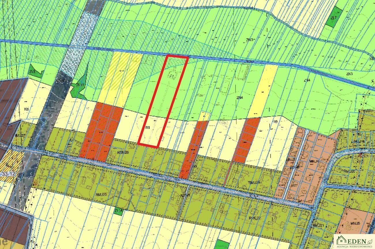 Zgodnie z miejscowym planem zagospodarowania przestrzennego oznaczona jest symbolem RMU - teren zabudowy mieszkaniowej jednorodzinnej i zagrodowej.