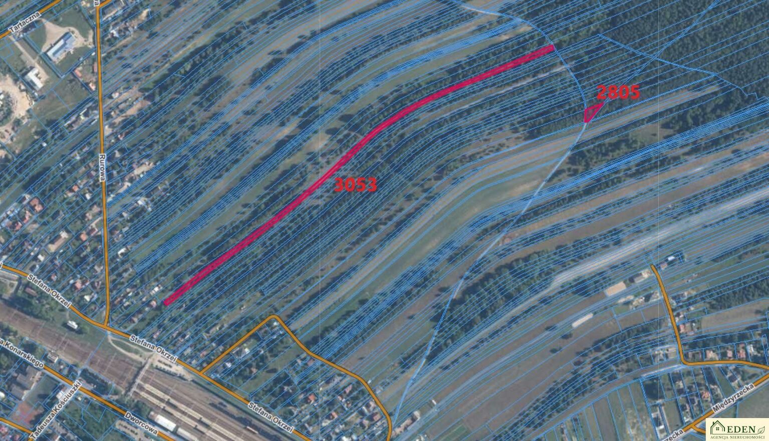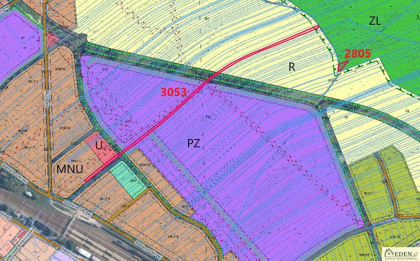 Działka nr 3053 o powierzchni 6259 m i szerokości od 6,5 do 8 metrów, która ciągnie się malowniczo wzdłuż terenów zielonych. Zgodnie z miejscowym planem zagospodarowania przestrzennego teren ten jest zróżnicowany pod względem przeznaczenia: część oznaczona jako MNU (mieszkaniowo-usługowa), część jako U (usługi), spory obszar jako PZ (tereny zielone) i R (rolna), a także fragment pod drogi (KD). Takie zróżnicowanie daje szerokie możliwości przyszłego wykorzystania działki od zabudowy po cele rekreacyjne czy usługowe.