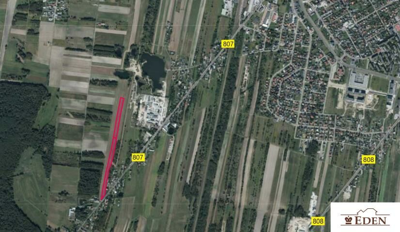 Działki (nr 1861/1 i 2018) z nowym wjazdem i chodnikiem. Szerokości ok. 21 m, dł. 767 m, położone przy drodze asfaltowej wojewódzkiej DW807 (Łuków-Stanin).