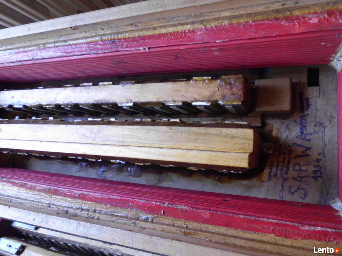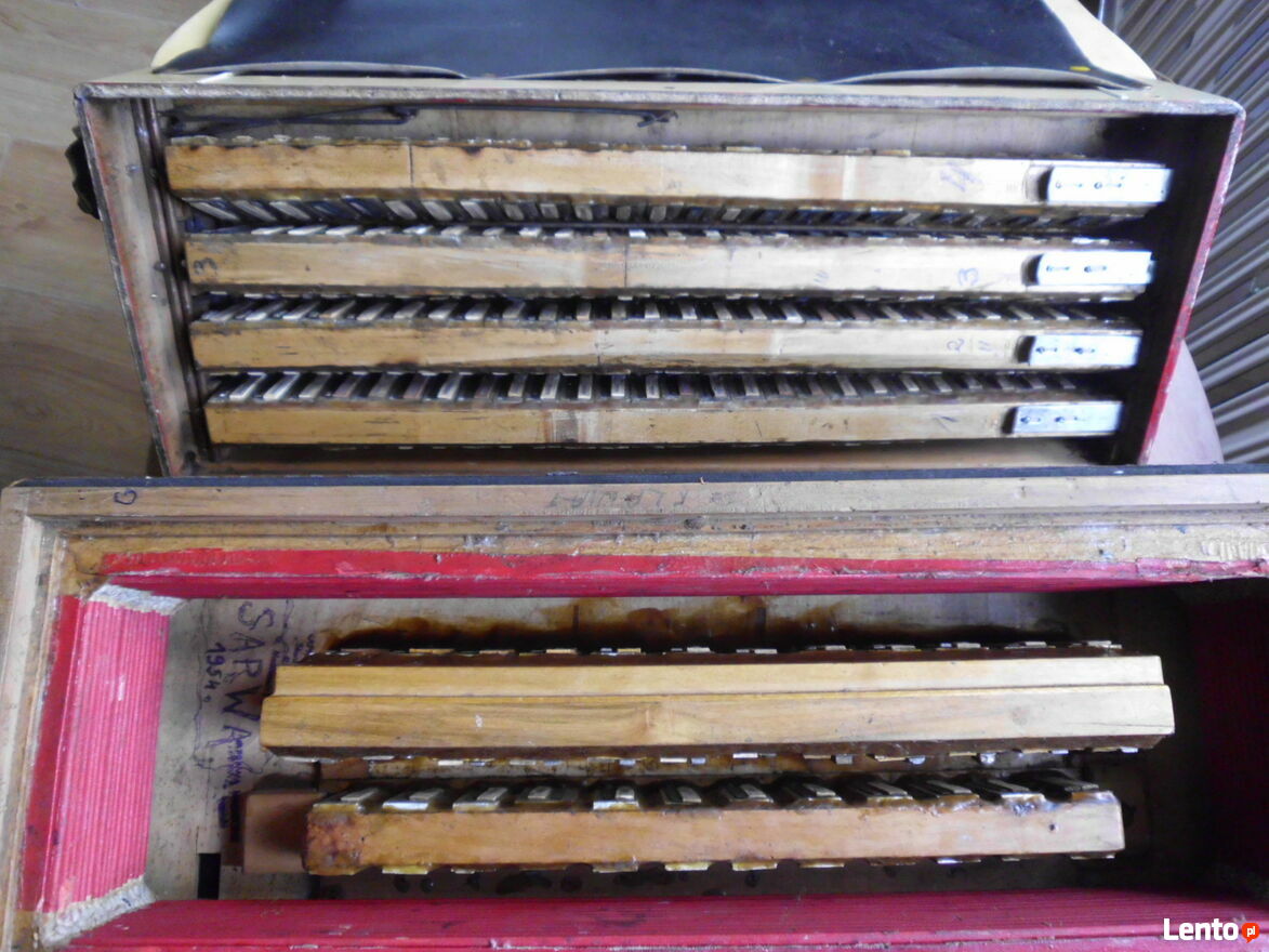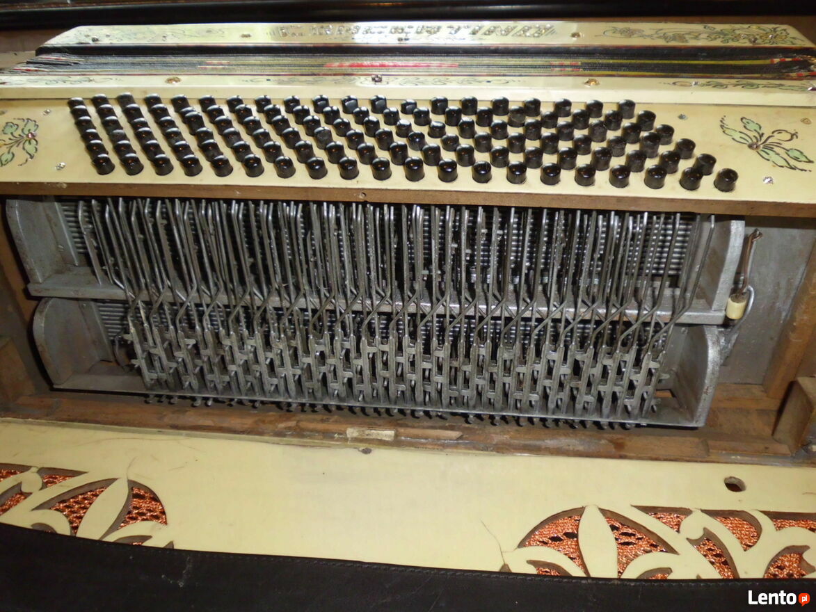 Harmonia 4 rzędowa bardzo rzadki okaz. Od strony melodycznej jak i basowej we wszystkich głośnicach na wszystkich głosach z obu stron od nowa klejone skórki i założone sprężynujące blaszki dociskowe i głosy klejone na nowy wosk. Do tego wszystkie klawisze mają wymienione nowe skórki na dekawkach. Strona basowa ma skórki na dekawkach te same. W mechanizmach registrów wymienione specjalne tulejki dzięki czemu wykasowany został luz. Generalnie najbardziej kosztowna i czasochłonna naprawa została dokonana natomiast strojenie dokończenie do stanu grającego pozostawiam nowemu nabywcy. Miech jest dobry. Do zakupu zachęcam prawdziwych pasjonatów dla których ten instrument ma wartość historyczną. Pytania proszę na tel. sześćset 1 dziewięć 4 trzy 0 pięć 2 Pozdrawiam z szacunkiem i zapraszam do zakupu.Sprawdź zainteresowanie tym ogłoszeniem