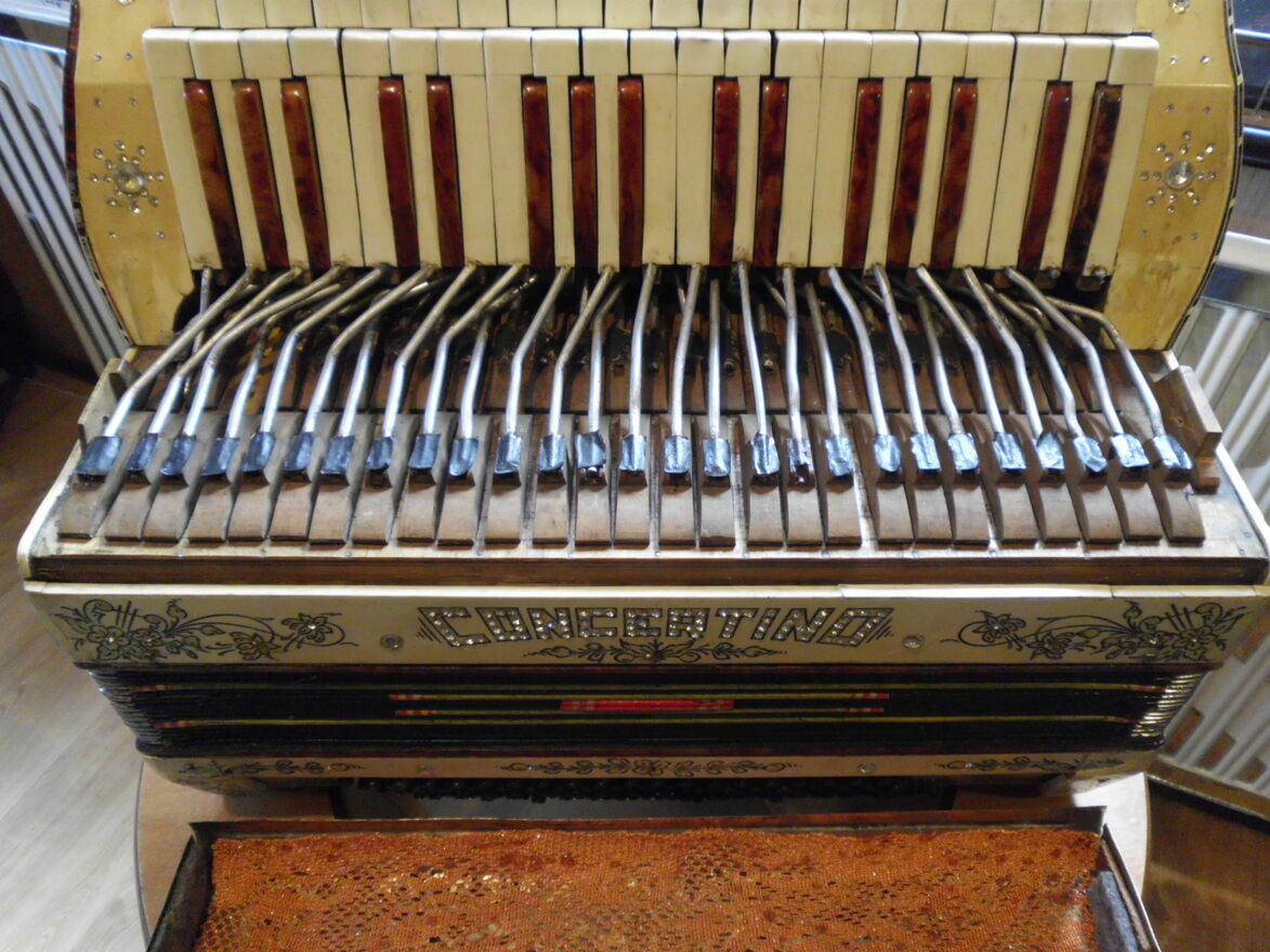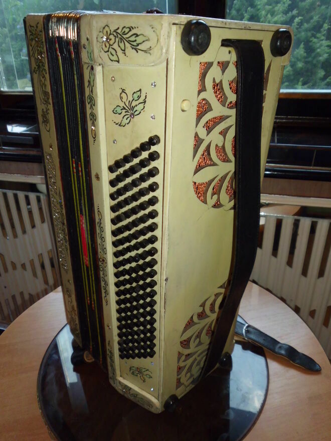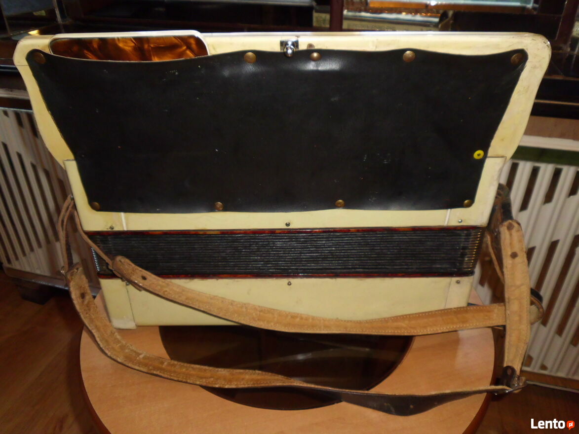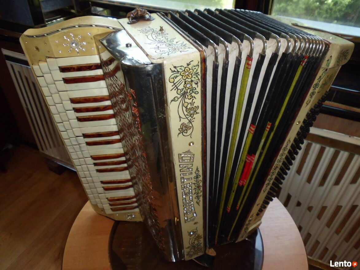 Harmonia 4 rzędowa bardzo rzadki okaz. Od strony melodycznej jak i basowej we wszystkich głośnicach na wszystkich głosach z obu stron od nowa klejone skórki i założone sprężynujące blaszki dociskowe i głosy klejone na nowy wosk. Do tego wszystkie klawisze mają wymienione nowe skórki na dekawkach. Strona basowa ma skórki na dekawkach te same. W mechanizmach registrów wymienione specjalne tulejki dzięki czemu wykasowany został luz. Generalnie najbardziej kosztowna i czasochłonna naprawa została dokonana natomiast strojenie dokończenie do stanu grającego pozostawiam nowemu nabywcy. Miech jest dobry. Do zakupu zachęcam prawdziwych pasjonatów dla których ten instrument ma wartość historyczną. Pytania proszę na tel. sześćset 1 dziewięć 4 trzy 0 pięć 2 Pozdrawiam z szacunkiem i zapraszam do zakupu.Sprawdź zainteresowanie tym ogłoszeniem