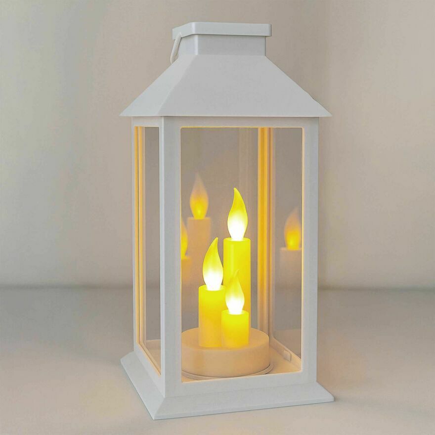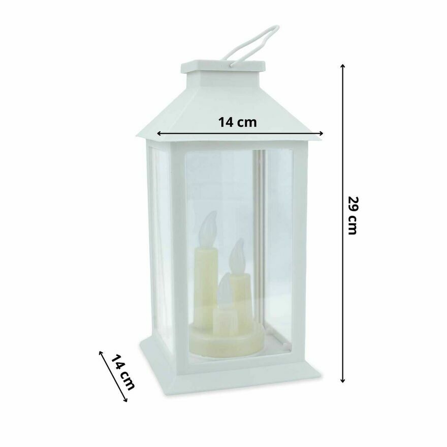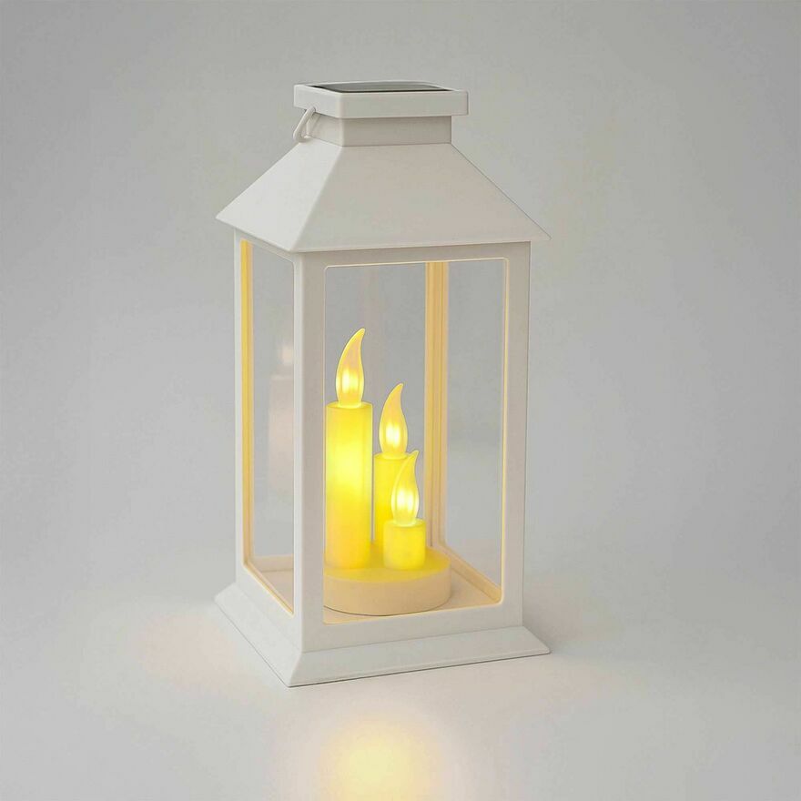Biały znicz solarny LED o wysokości 29 cm. Ładuje się w dzień, a po zmroku zapala się automatycznie ciepłym światłem przypominającym świecę.Wymiary 29 x 14 x 14 cm