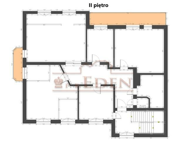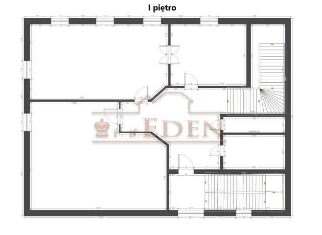 Całkowita powierzchnia kondygnacji to ok. 140 m, która jest podzielona na 5 lokali (31 m, 27,5 m, 12,5 m, 22 m, 10 m), 2 łazienki i korytarz. Z dwóch lokali mamy wyście na balkon. Do wszystkich pomieszczeń wejście z korytarza. Wysokość sufitu na tym piętrze to 2,5 m.