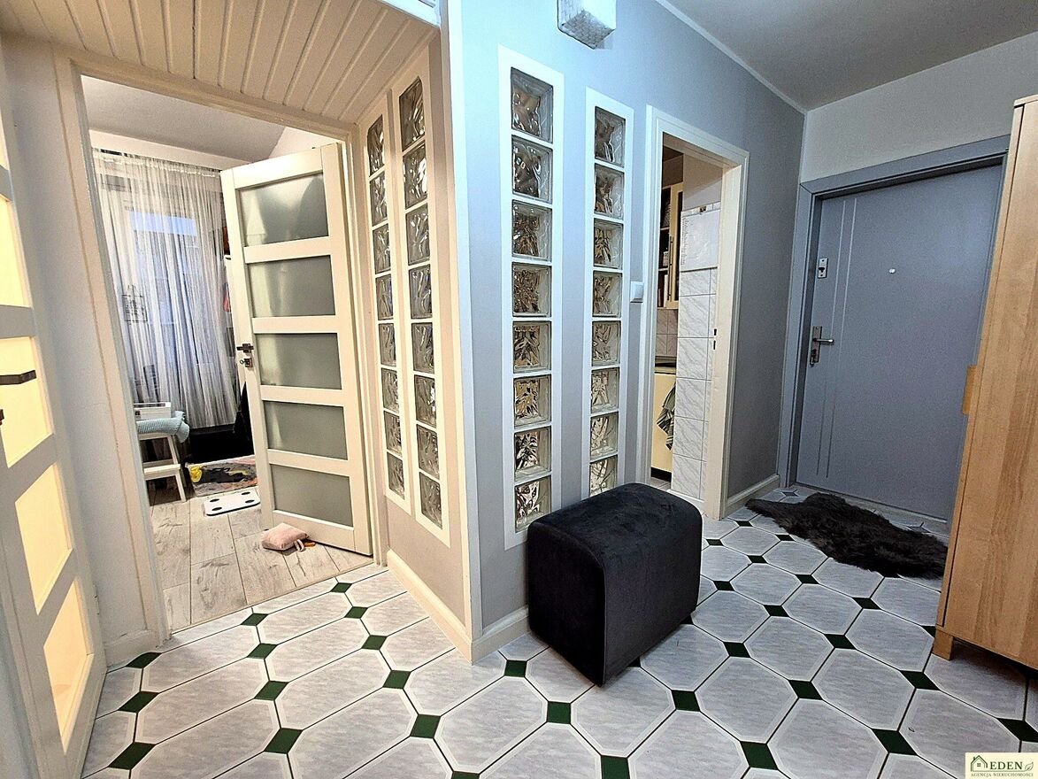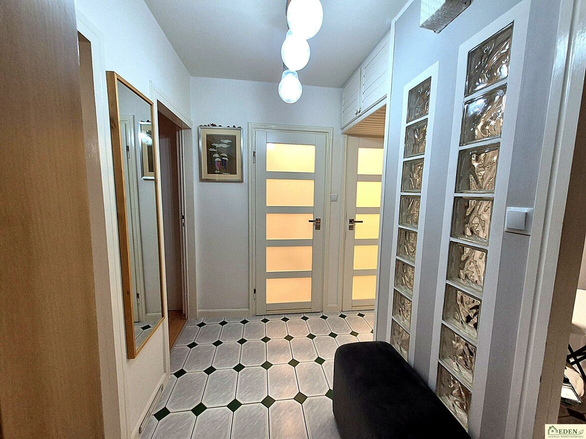 Pomiędzy kuchnią a przedpokojem zamontowane zostały luksfery rozświetlające pomieszczenia i nadające im niepowtarzalnego klimatu. Garderoba wykonana rok temu. Na podłogach w pokojach znajdują się panele, natomiast w pozostałych pomieszczeniach terakota. Szerokie, podwójne drzwi pomiędzy balkonem a salonem ułatwiają swobodną komunikację integrując te dwie strefy w wyszukany sposób, okna PCV.