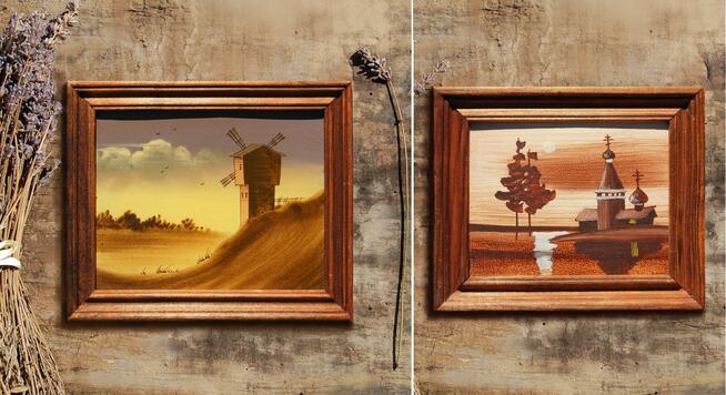 1. Stary, rosyjski obrazek olejny- pejzaż z młynem wśród pól. Obrazek jest ręcznie namalowany farbami olejnymi na ...