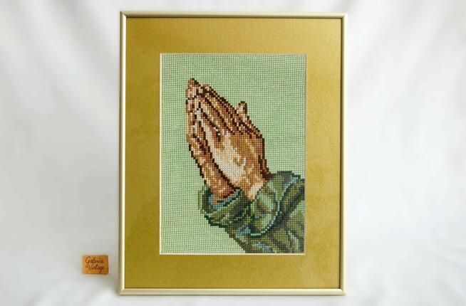 Piękny obraz przedstawiający "Dłonie w modlitwie" Arbrechta Dürera. Obraz jest ręcznie haftowany w odcieniach zieleni, ...