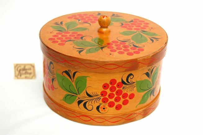 Drewniany, okrągły pojemnik z pokrywką, zdobiony pięknym ornamentem jarzębiny w stylu chochłoma. Pojemnik pochodzi z ...