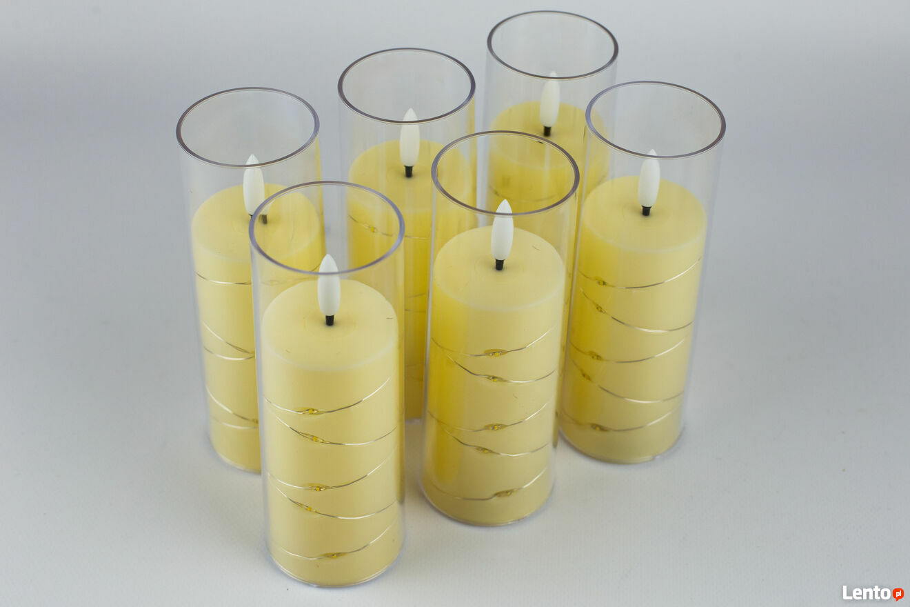 Sprzedam zestaw 6 eleganckich, bezpiecznych zniczy LED w akrylowych tubach. Każdy znicz ma 18 cm wysokości i 5 cm średnicy. Idealne na cmentarz, balkon, taras lub do dekoracji wnętrza.Świecą ciepłym, migoczącym światłem imitującym prawdziwy płomień.